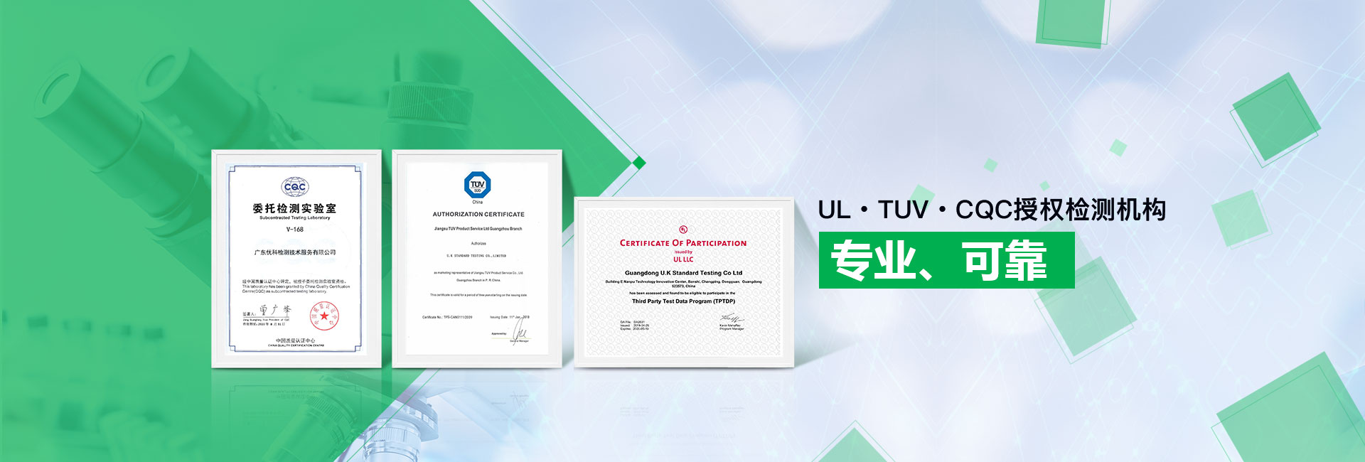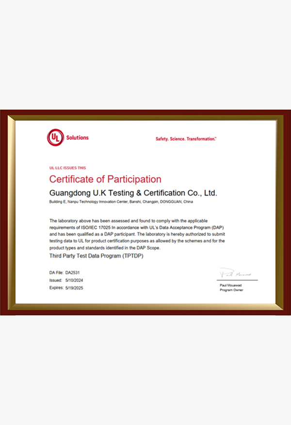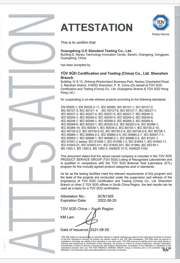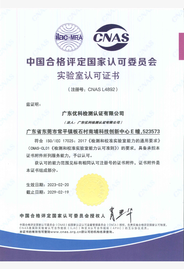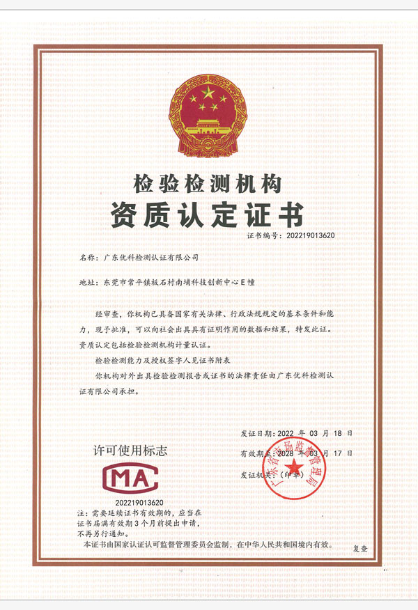 廣東優(yōu)科檢測認(rèn)證有限公司(簡稱:UKK)成?于2007年,是國內(nèi)專業(yè)的汽車整車及零部件、電子元器件第三方檢測實(shí)驗(yàn)室,國家級(jí)中小企業(yè)公共(技術(shù))服務(wù)示范平臺(tái),獲得了國家?新技術(shù)企業(yè)、廣東省專精特新中小企業(yè)、市級(jí)工程技術(shù)研發(fā)中心等榮譽(yù)稱號(hào)。 More